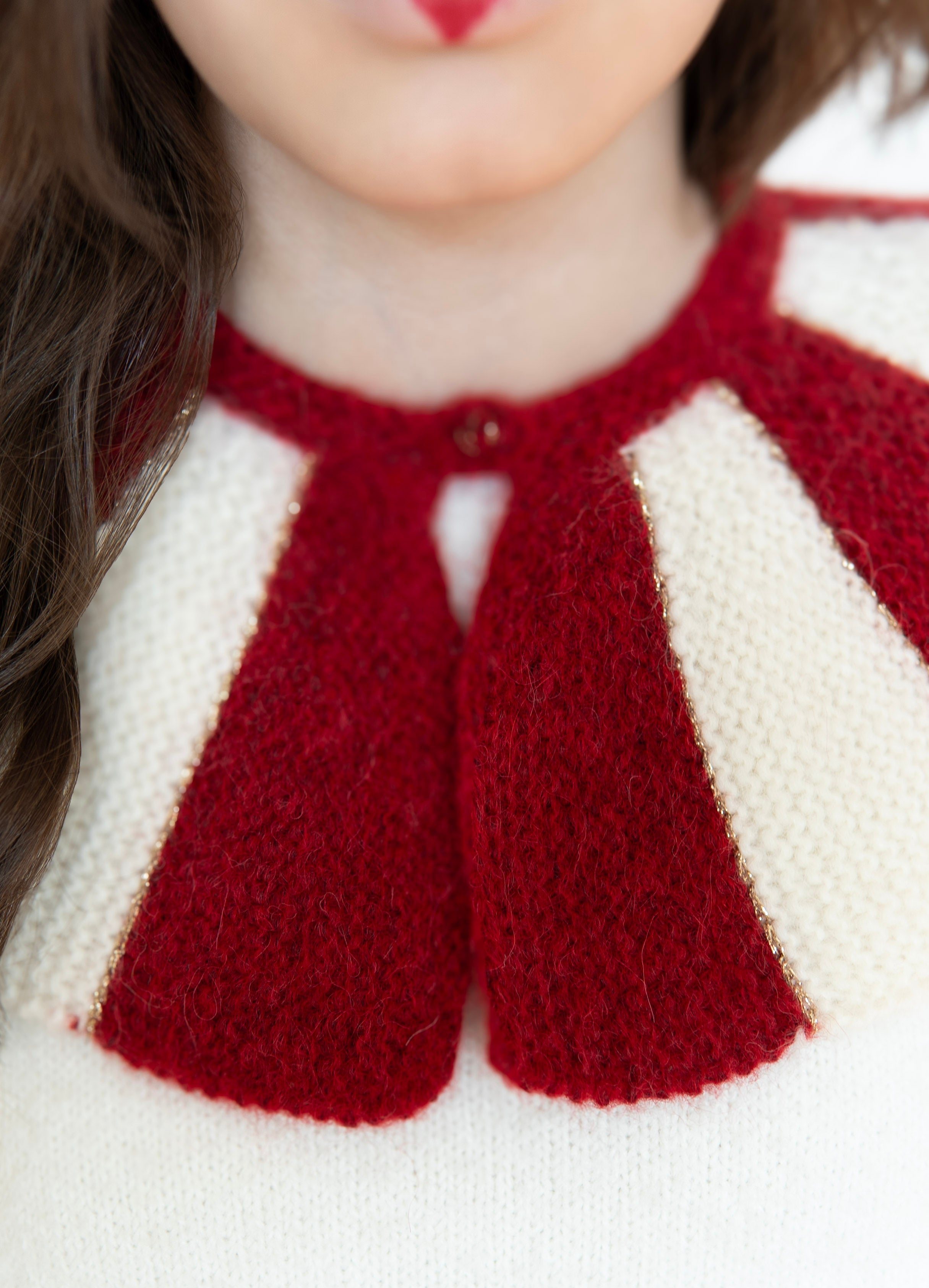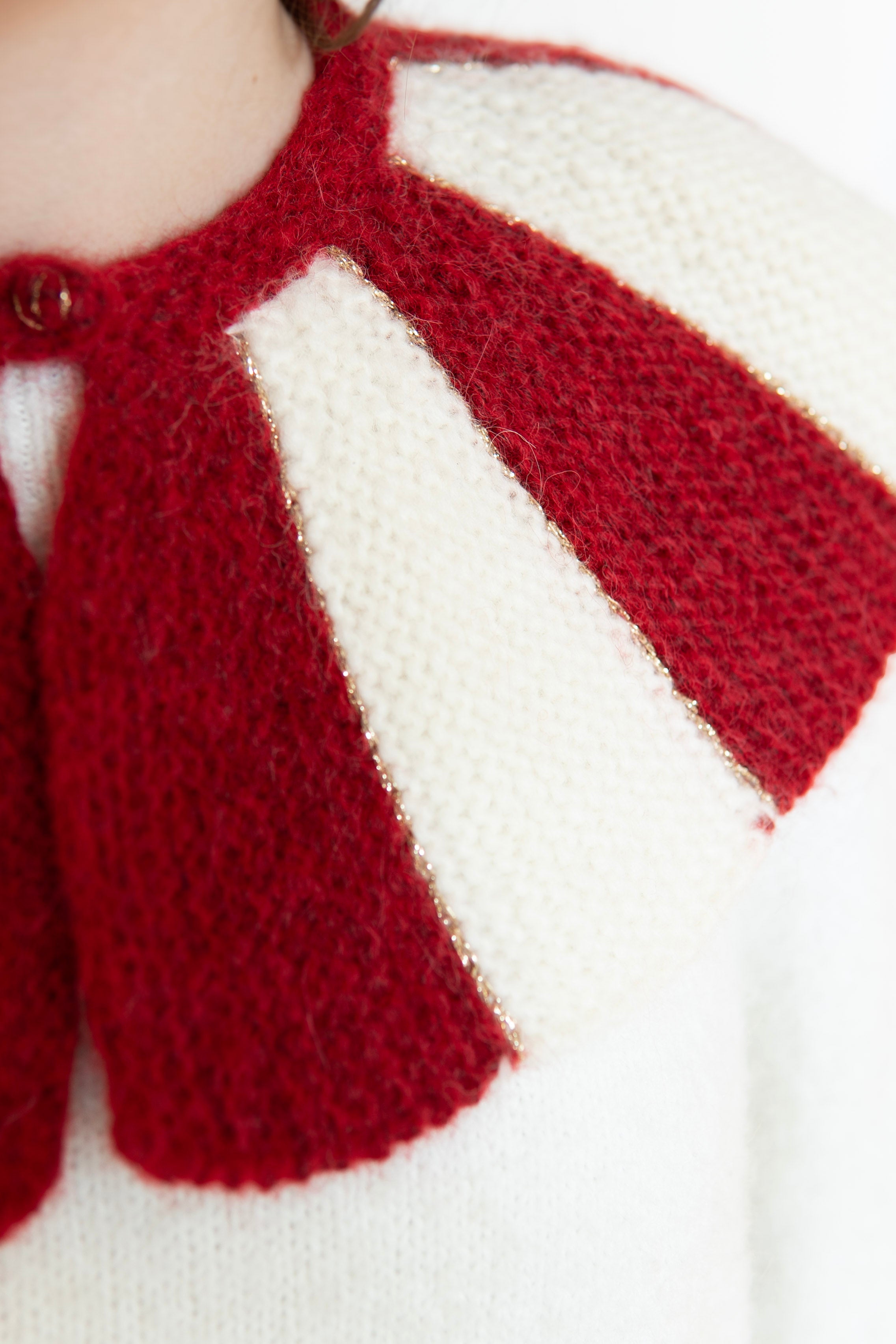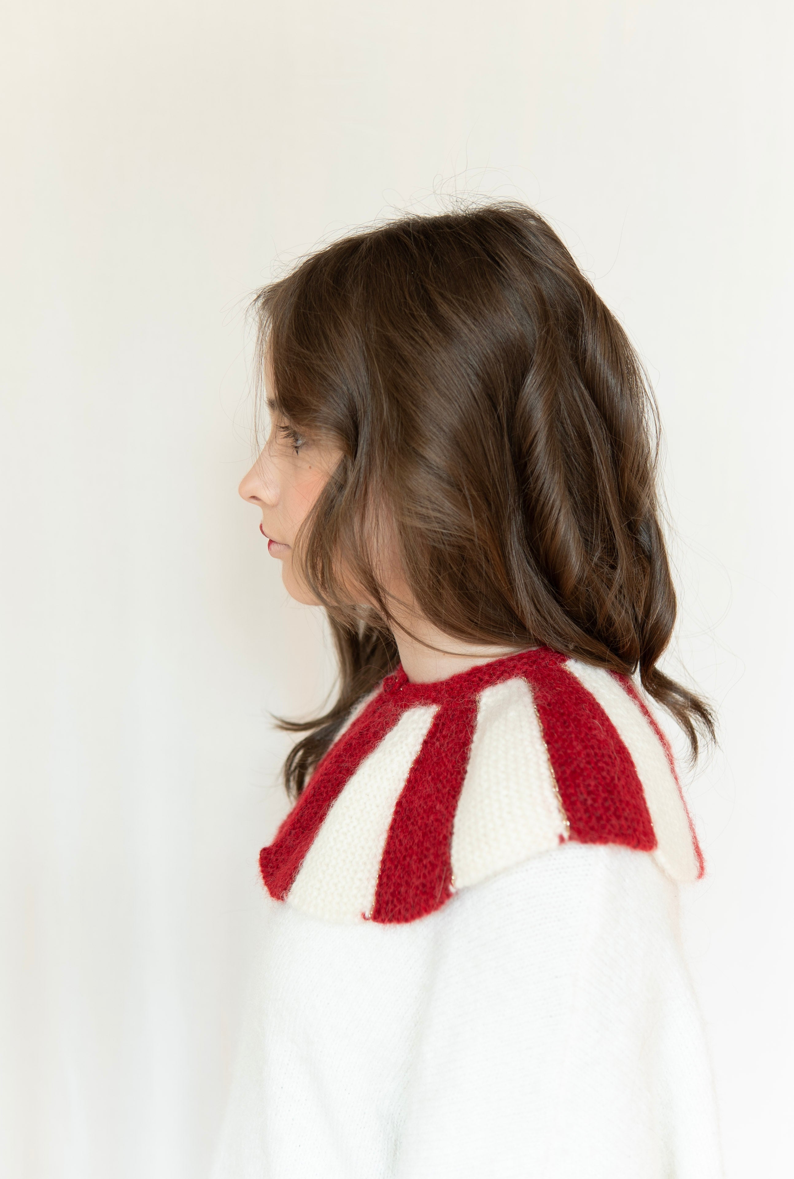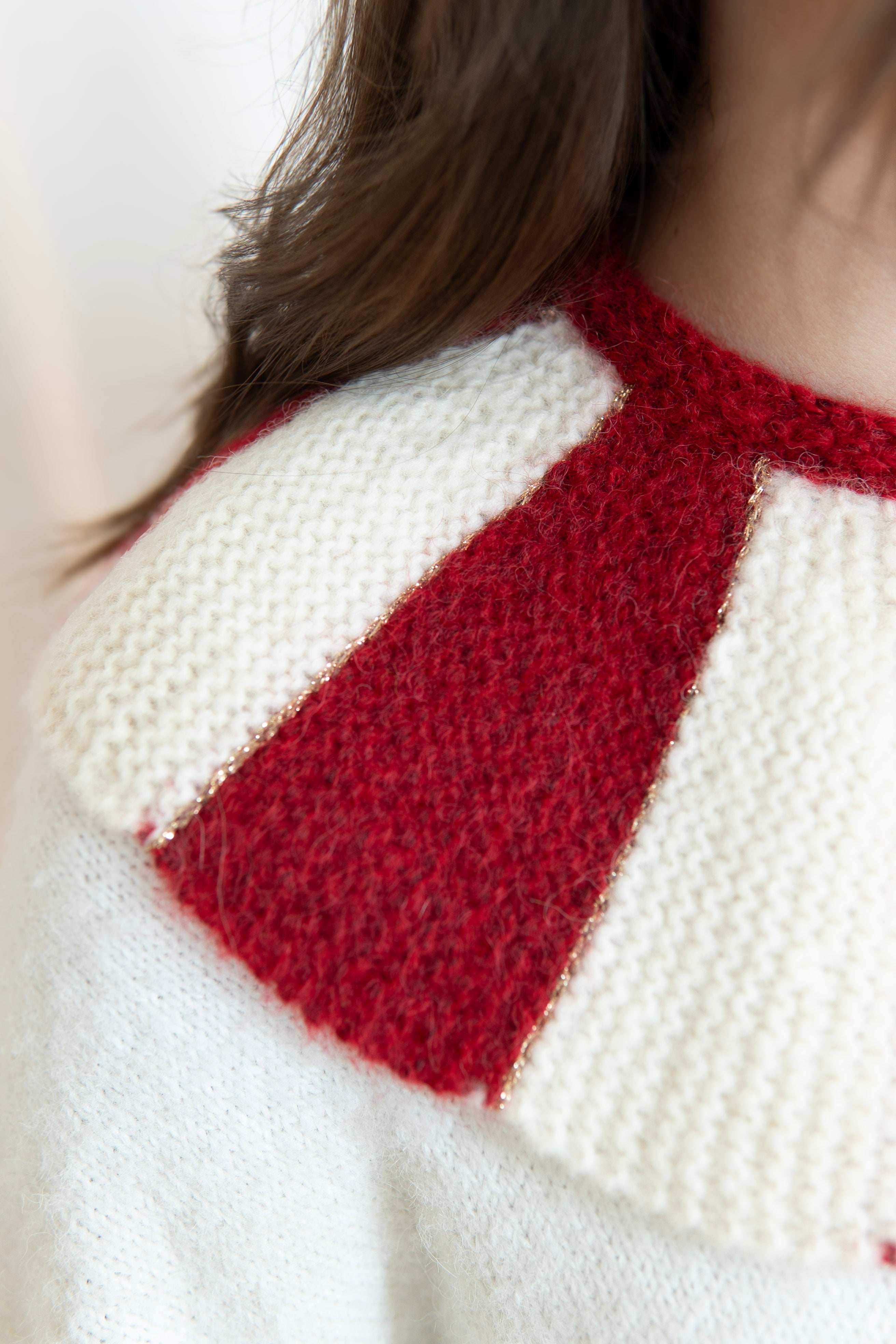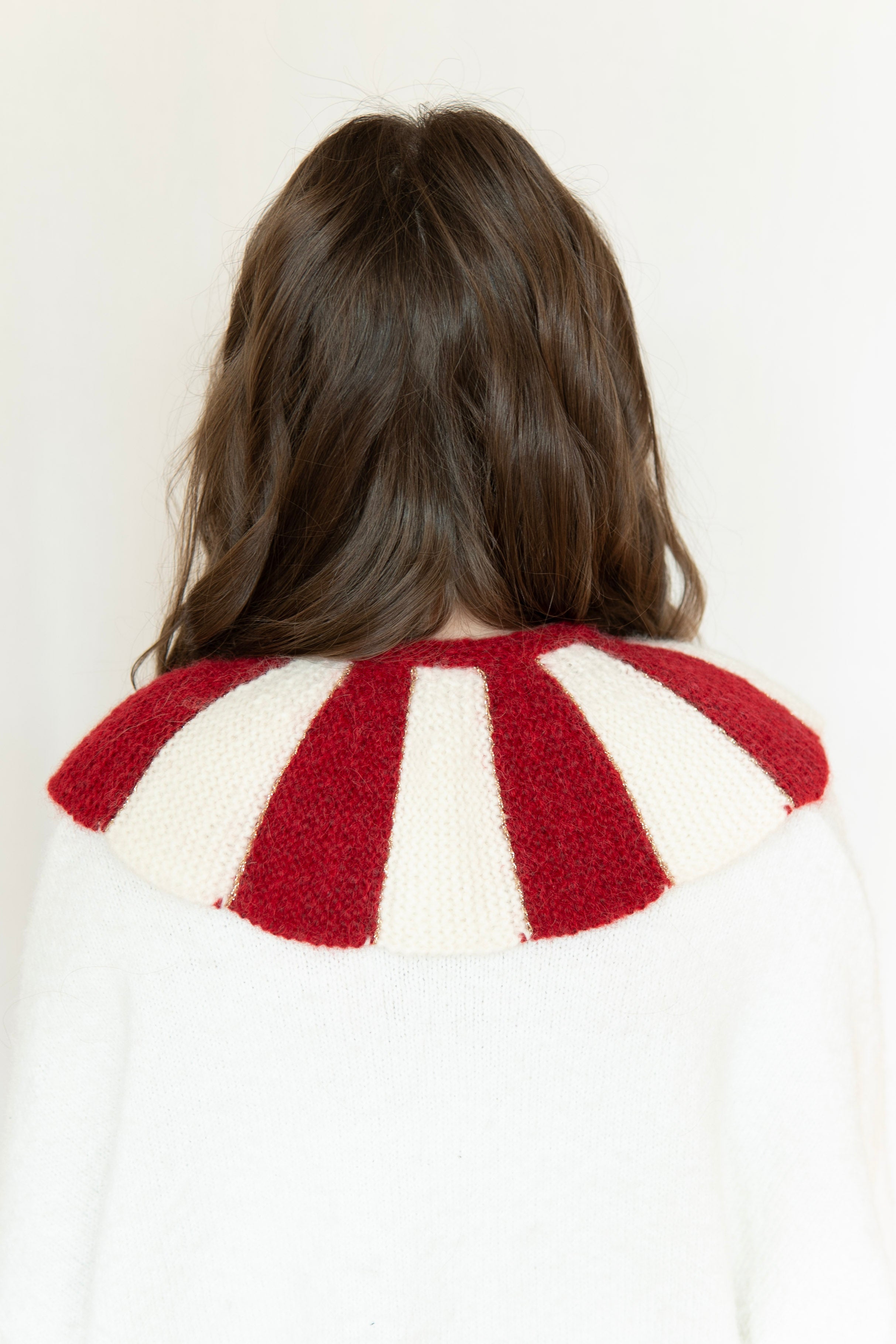 Stripe Collar is a detachable knitted accessory designed to elevate any outfit. The structured red and ivory stripes create a bold silhouette while remaining soft and comfortable to wear.