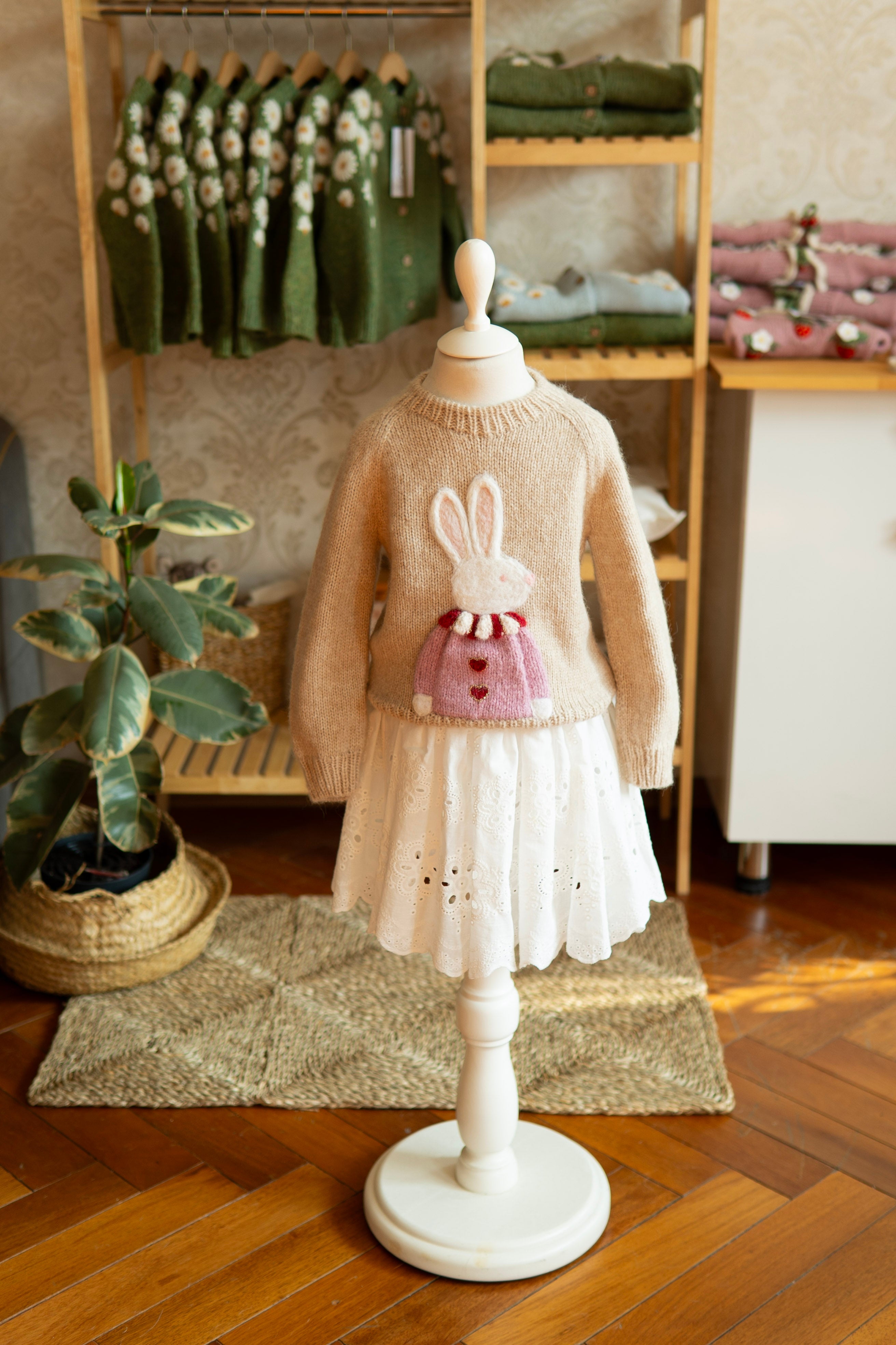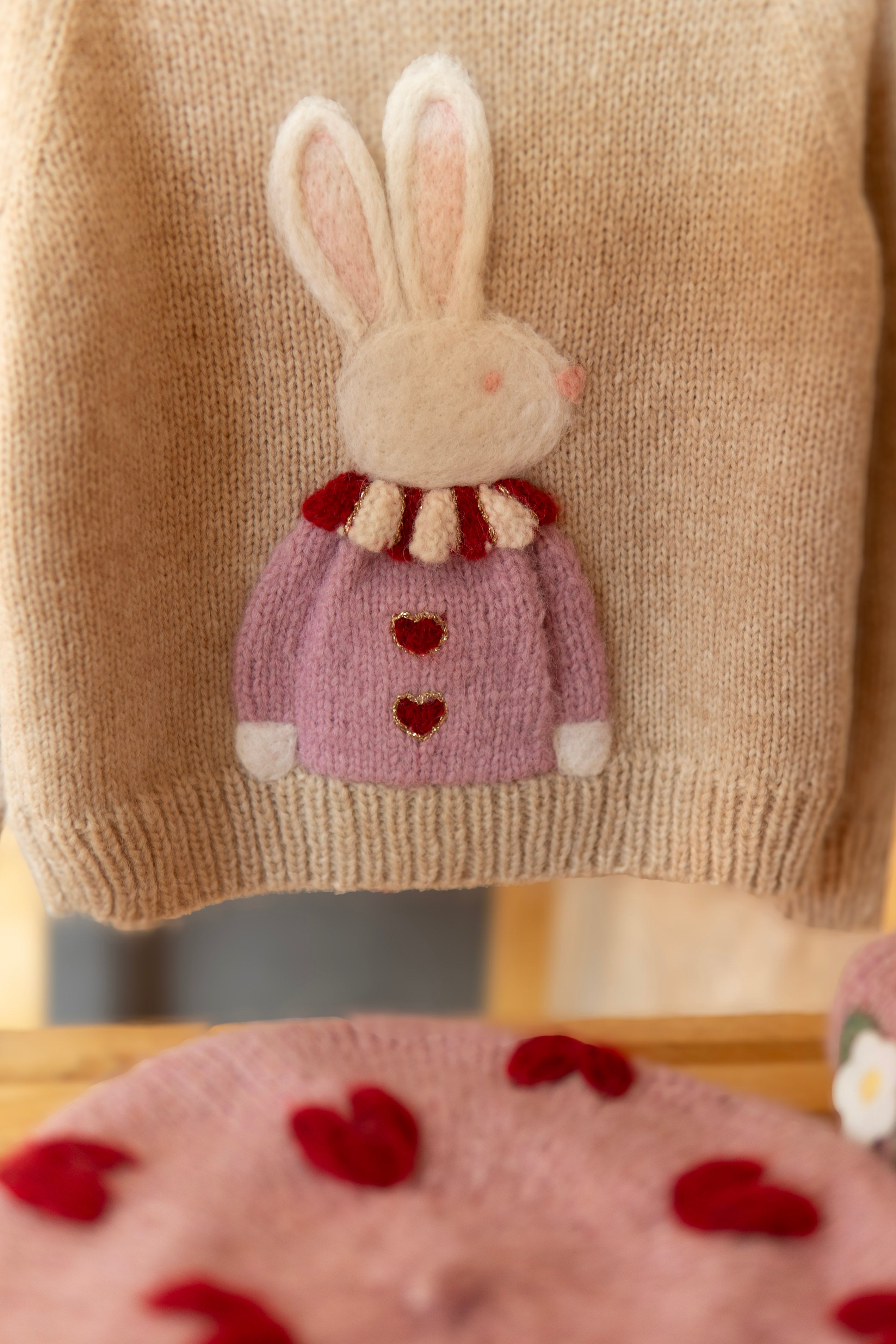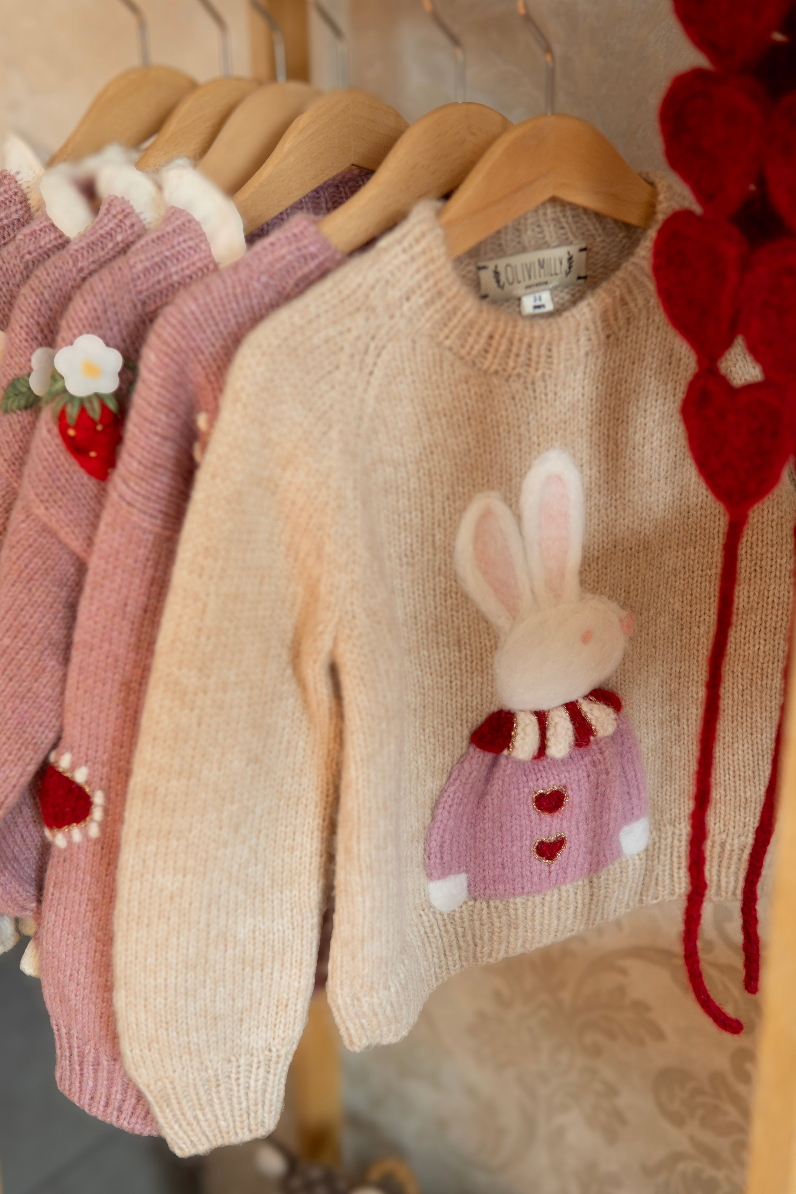 White Rabbit Jumper features delicate hand embroidery inspired by a gentle woodland character. The design is clean and balanced, with soft color accents that create a calm and refined look.