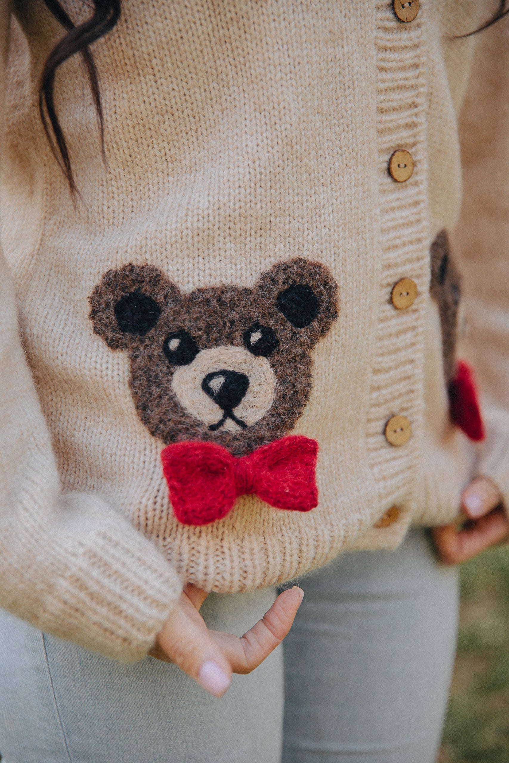 This wheat-coloured cardigan is crafted from soft natural yarn and detailed with expressive bear motifs on the front panels. Each bear is made using hand embroidery combined with shaped wool accents, giving the design a warm, textured look. The relaxed fit and natural fibres make the cardigan comfortable for everyday layering.