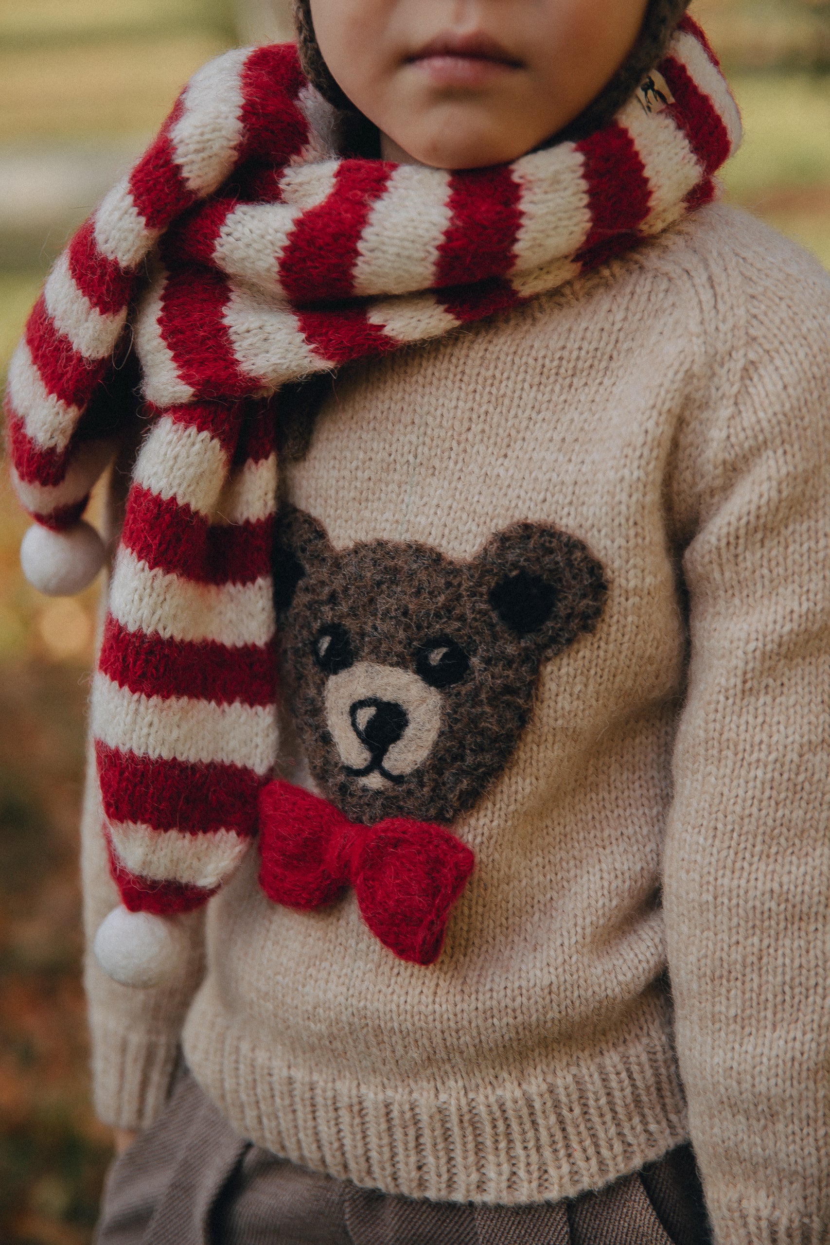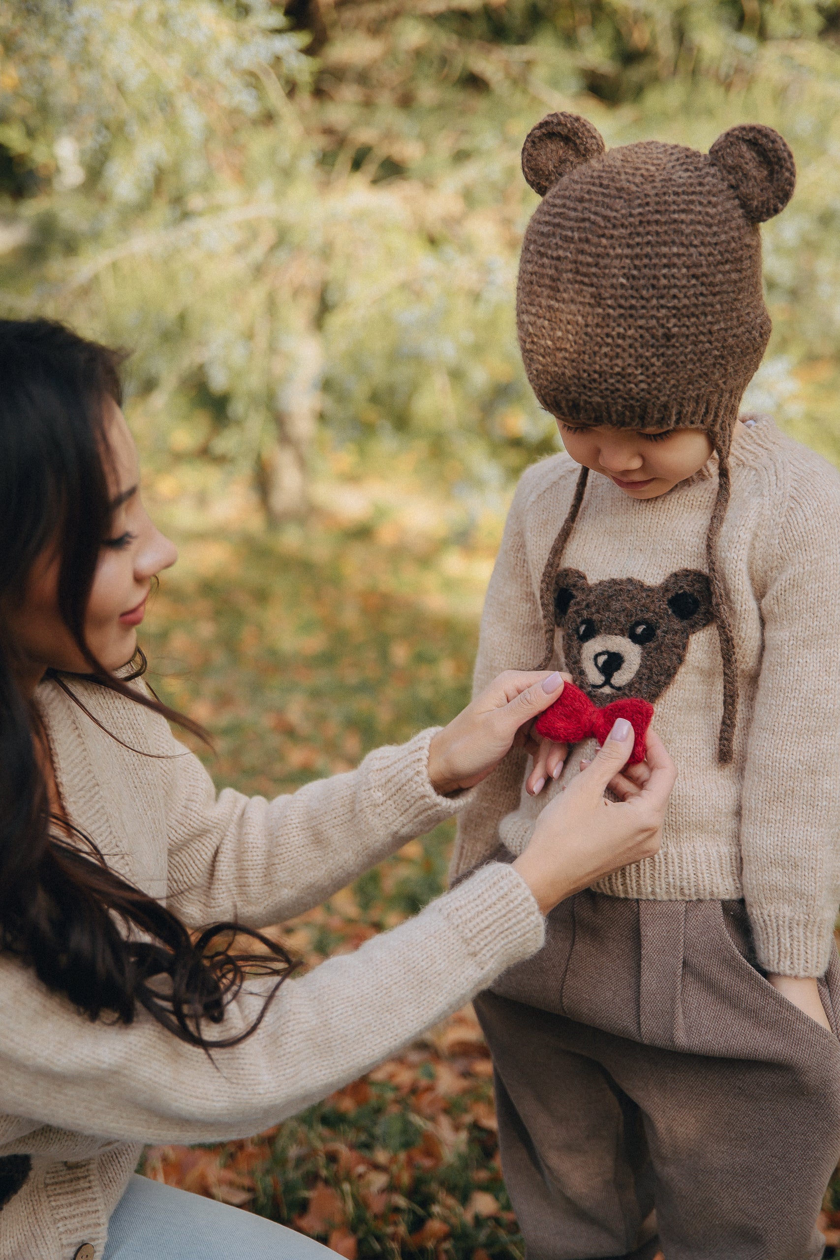 This wheat-coloured jumper is crafted from soft natural yarn and decorated with a detailed bear motif made using hand embroidery and shaped wool elements. The design features expressive eyes, a textured muzzle, and a three-dimensional bow tie, giving the jumper a warm and playful character. Comfortable, breathable, and gentle on the skin, it’s ideal for everyday wear and holiday photos.