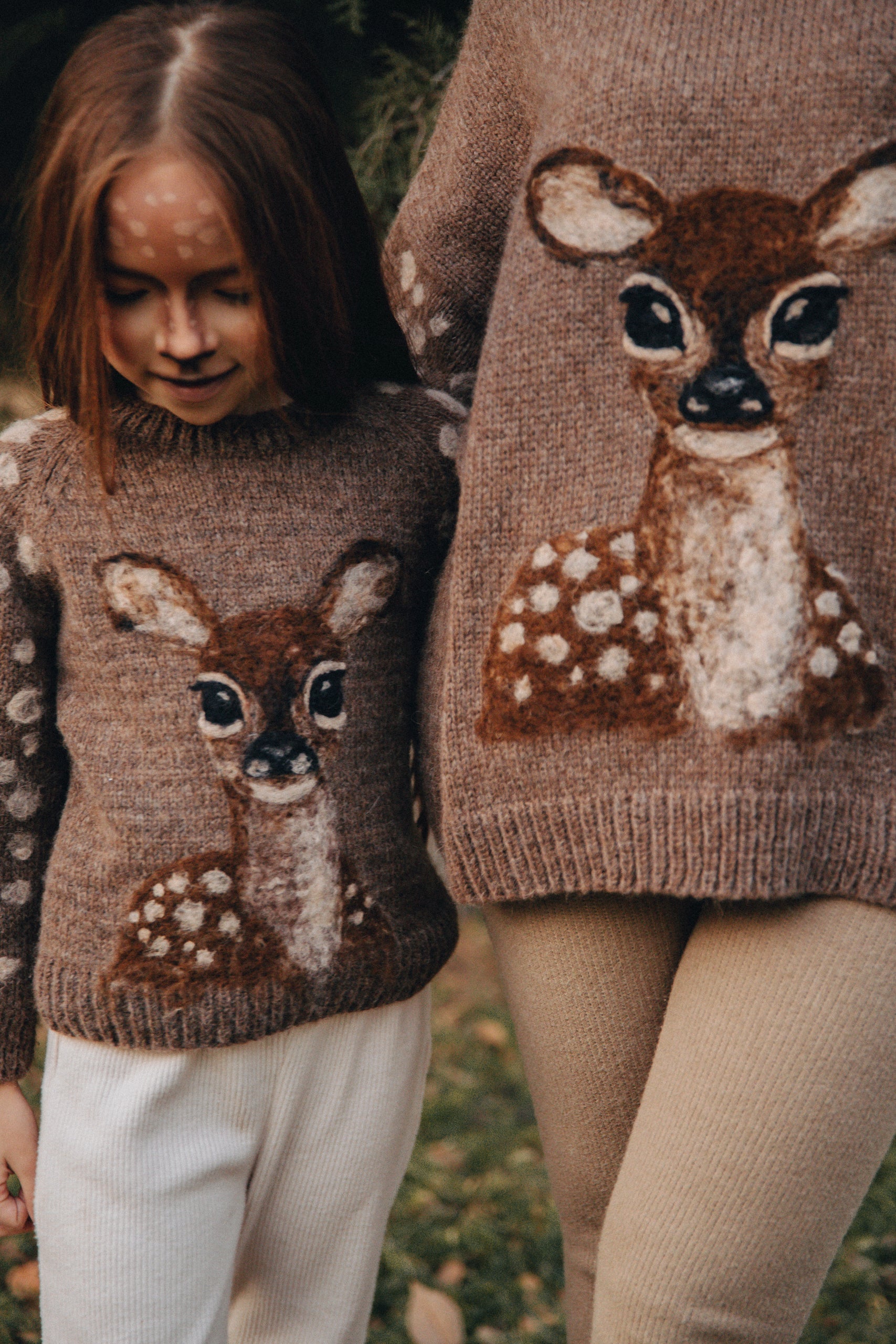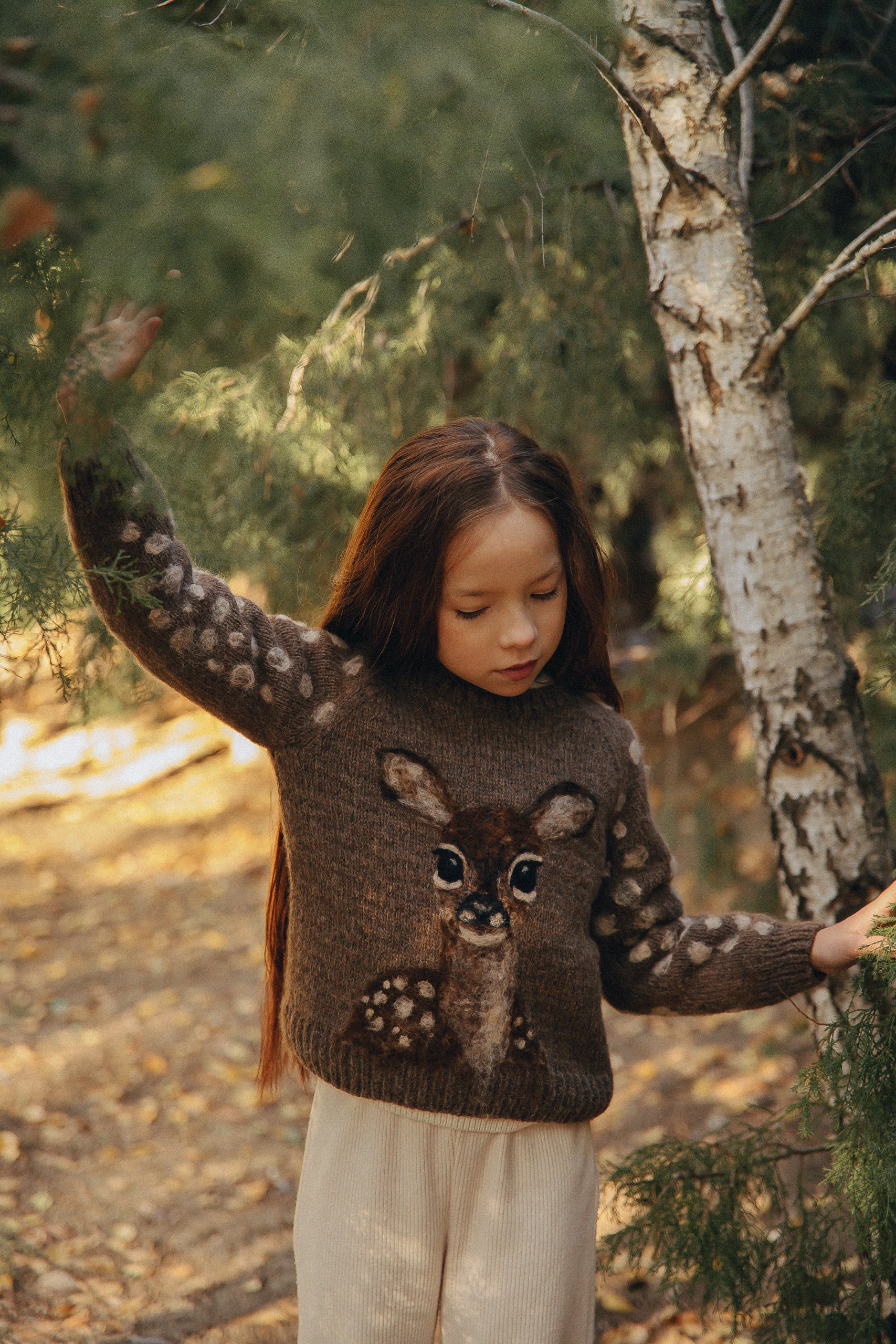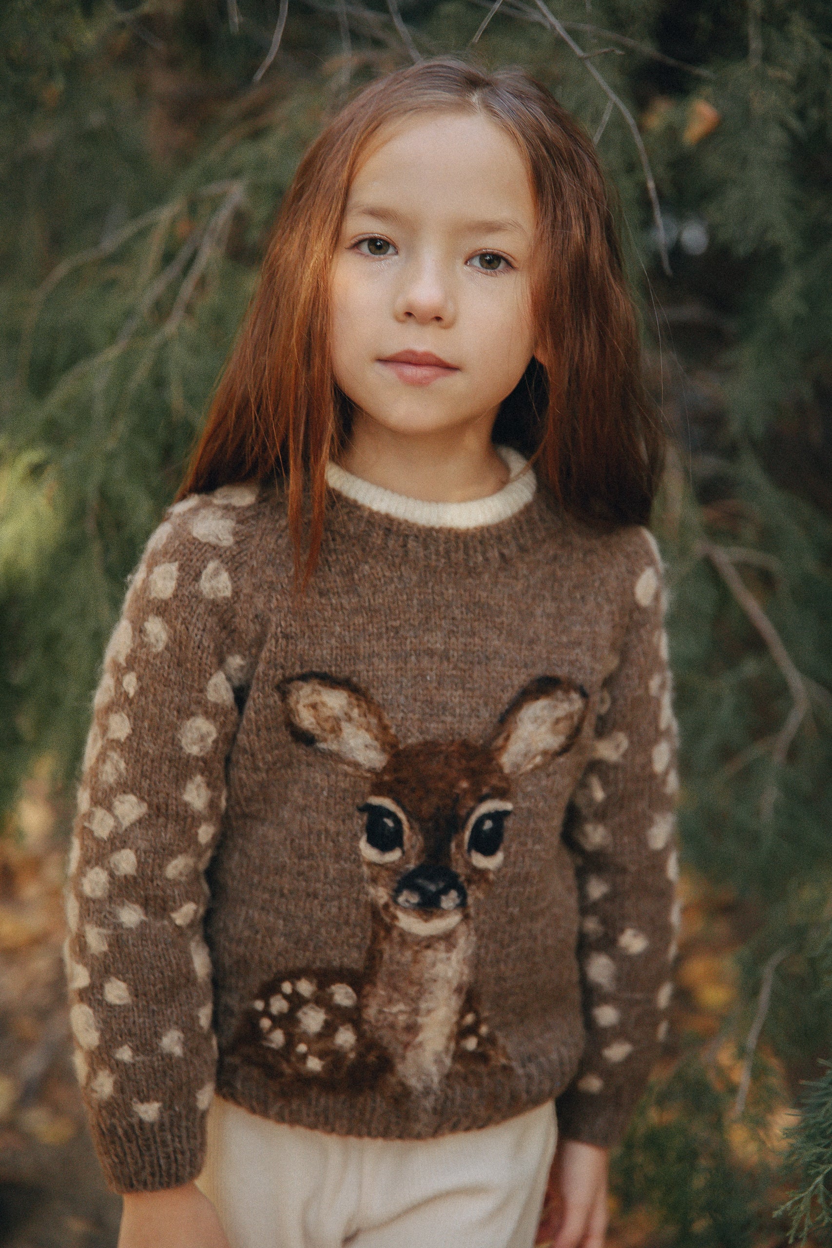 This jumper is made from soft natural yarn and decorated with a detailed deer motif created in a unique wool-painting technique. The textured illustration adds depth, softness, and a warm woodland character to the design. The model is lightweight, comfortable, and suitable for both boys and girls.